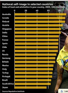 Just as some people have a better self-image than others, so it seems do countries. In a poll of 33 nations by the Reputation Institute, a branding consultancy, people were asked to rate their trust, admiration, respect and pride in their country. The results are presented as an index. By this measure, Australians are almost as exuberant about their country as they are about sport, and lead the list. They are followed closely by Canadians. Americans, normally a patriotic and positive bunch, are perhaps being affected by the recession.